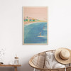 Dieses hochwertige Holzbild zeigt eine idyllische Küstenszene aus Australien, in der Surfer auf sanften Wellen gleiten, während bunte Häuser und Palmen im Hintergrund die sommerliche Atmosphäre vervollständigen. Das Motiv strahlt Ruhe und Freiheit aus und fängt den entspannten Lebensstil der australischen Küste perfekt ein.