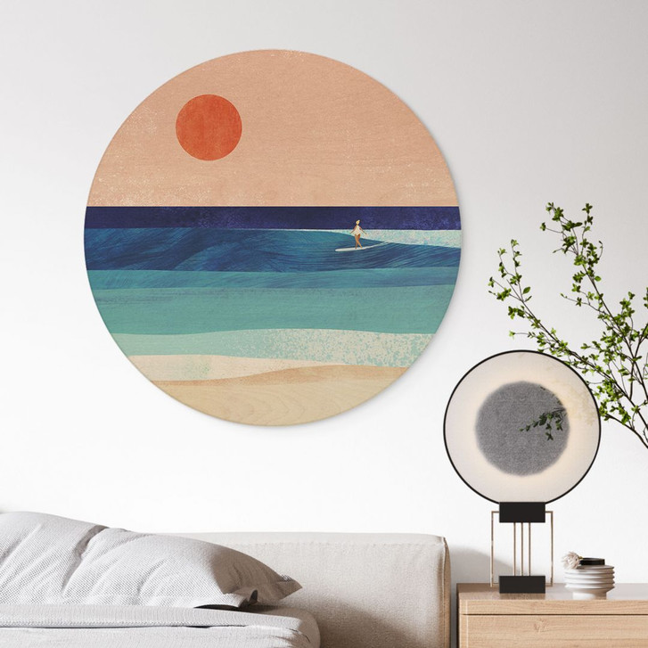 Das stimmungsvolle Motiv „Surfer Girl at Sunset“ von Henry Rivers verbindet die Leichtigkeit des Surfens mit der natürlichen Eleganz eines runden Holzbildes. Die warme Textur des Holzes verstärkt die Tiefe der Farben und verleiht dem Motiv einen organischen Look, der perfekt mit den sanften Tönen des Himmels und des Ozeans harmoniert. Das runde Format betont die sanften Linien und Bewegungen der Szenerie und macht das Bild zu einem harmonischen Blickfang.