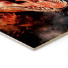 Die meisterhafte Kombination von feurigen Orange- und Rottönen mit kühlen, nebligen Blau- und Grautönen erzeugt einen eindrucksvollen Kontrast, der die Dramatik des Motivs verstärkt. Das natürliche Holz als Hintergrund verleiht dem Bild eine besondere Tiefe und sorgt für eine hochwertige, elegante Optik, die in jedem Raum zum Blickfang wird.