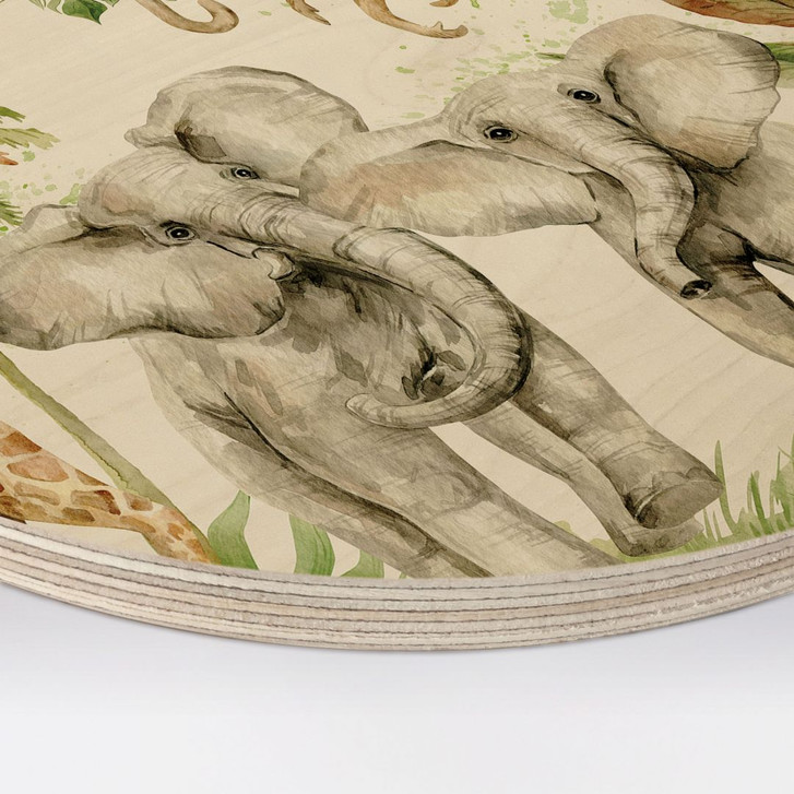 Das Kinderzimmer ist ein Ort zum Spielen und Toben, aber auch ein Rückzugsort für die Kleinen zum Ausruhen und Entspannen. Daher ist es besonders wichtig, diesen Raum individuell und abwechslungsreich zu gestalten. Das runde Holzbild mit dem Kunstdruck von UN Designs ist ein besonderer Hingucker im Kinderzimmer. Das Leinwandbild zeigt Giraffen, Elefanten, Affen, Papageien, Kakadus und Erdmännchen im tropischen Dschungel zwischen Palmen.