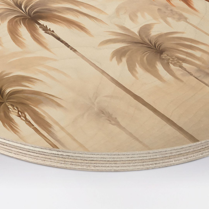 Dieses runde Holzbild vereint die beruhigende Schönheit tropischer Palmen mit der warmen, natürlichen Ausstrahlung von Holz. Die sanften Erd- und Orangetöne des Palmenmotivs vermitteln die Gelassenheit eines tropischen Sonnenaufgangs, während die geschwungenen Formen der Palmen eine friedliche, fast verträumte Atmosphäre schaffen.