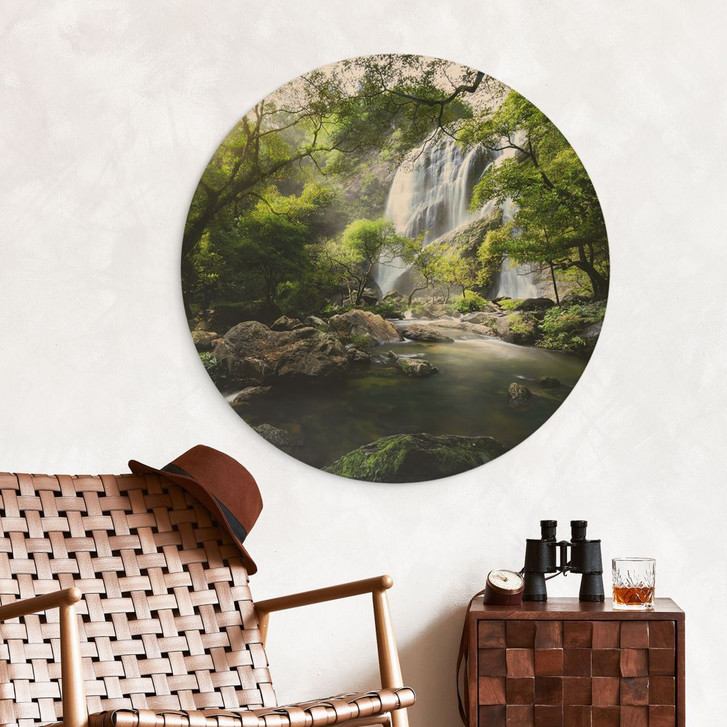Holzbild Wasserfall im Wald - Naturfotografie Rund - Foto