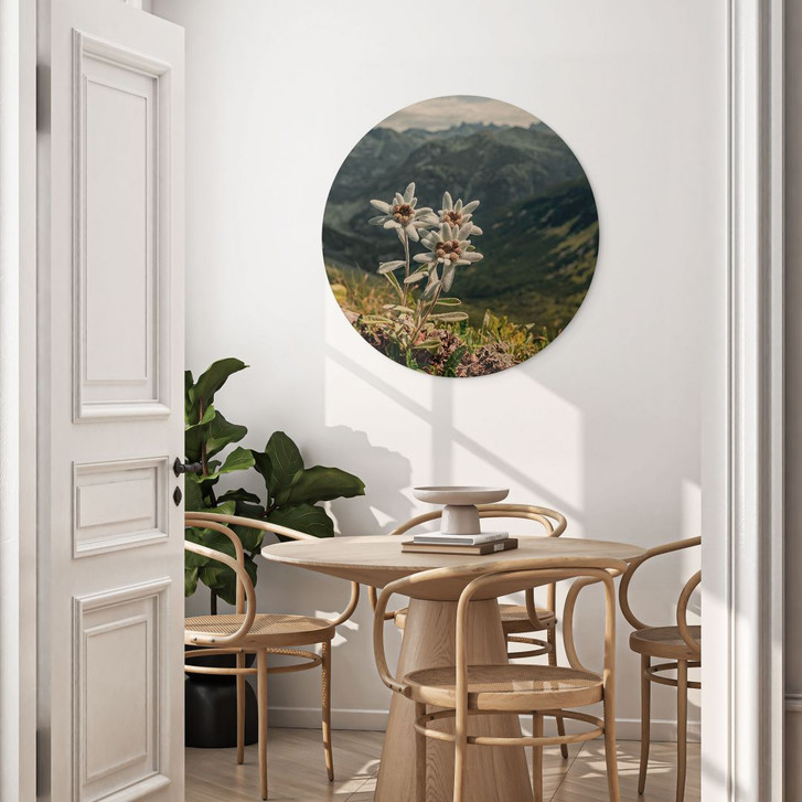 Dieses runde Holzbild zeigt das Edelweiss, eine der berühmtesten Blumen der Alpen, die für Reinheit und Schönheit steht. Die zarten weissen Blütenblätter der Pflanze erheben sich stolz vor der beeindruckenden Kulisse der Alpen. Umgeben von üppigem Grün und majestätischen Bergen bringt dieses Bild unberührte Natur direkt in dein Zuhause.