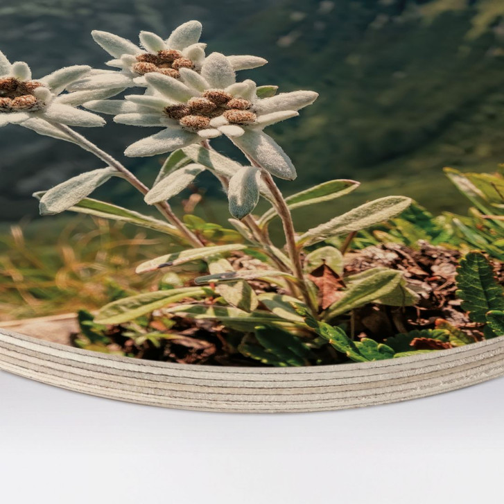 Holzbild Weisser Alpen-Edelweiss auf dem Berg - Rund