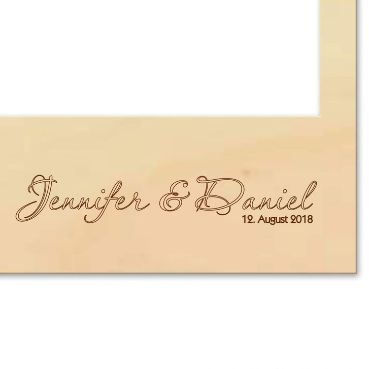 Bitte gib deine beiden Vornamen und ein Datum in das Eingabefeld ein. Wenn die Namen zu lang sind, passen wir sie optisch an. In diesem Fall kann deine Lieferung von der Musteransicht abweichen.