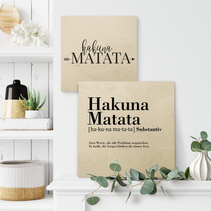 Entdecke Wohnaccessoires im quadratischen Format und verwöhne deine Augen mit diesem bekannten Sprichwort! Der Ausdruck Hakuna Matata stammt aus der afrikanischen Sprache Swahili und bedeutet: Es gibt keine Probleme oder keine Sorgen. Das typografische Motiv als Holzbild in Beige sorgt immer für gute Stimmung. Ermutigende Sprüche und Zitate sind wichtiger denn je. Sie geben Kraft und hoffnungsvolle Gedanken, die sich positiv auf das Gehirn und damit auf das Leben auswirken. Nachhaltige Produkte aus Holz werden immer beliebter. Denn der natürliche Rohstoff passt zu vielen Einrichtungsstilen, lässt sich zu jeder Jahreszeit ergänzen und hat eine zeitlose Schönheit. Die Natürlichkeit von Holz steigert das Wohlbefinden in den eigenen vier Wänden und zaubert mit seiner einzigartigen Maserung eine unvergleichliche Atmosphäre.