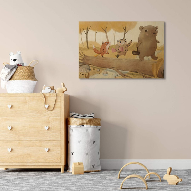 Das Kinderzimmer ist für die Kleinen eine Welt für sich. Umso wichtiger ist es, eine offene und einladende Atmosphäre zu schaffen. Mit kreativen und kindgerechten Accessoires kannst du dazu beitragen, diesen Wohlfühlort noch angenehmer zu gestalten. Mit dieser Illustration der Künstlerin Judith Loske schaffst du einen gekonnten Hingucker in deinem Kinderzimmer. Der Fuchs, die Eule und der Bär, ausgestattet mit einer Decke und einem Korb, sind auf dem Weg zu einem Picknick im Park.