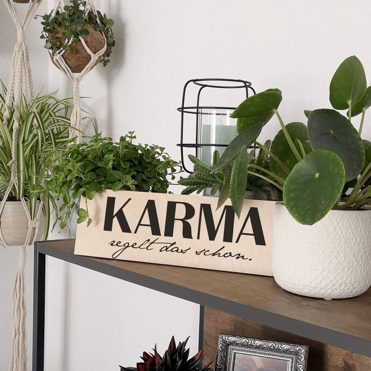 Verleihe deinem Wohnzimmer mit diesem Wandbild einen modernen Flair! Dieses Statement überzeugt mit Humor und Schlagfertigkeit und zaubert gleichzeitig einen wunderschönen Hingucker. Karma ist ein Gesetz aus dem buddhistischen und hinduistischen Glauben, das den Zusammenhang zwischen Ursache und Wirkung definiert. Dieser Kreislauf erklärt, dass auch unsere Handlungen Konsequenzen nach sich ziehen. Wer etwas Gutes tut, bekommt es zurück. Diese asiatische Weisheit als raffiniertes Holzschild schmückt in moderner Optik die Wand und verleiht dem Raum ein gemütliches Wohngefühl. Mit dem Holzschild aus nachhaltigem Material setzt du wunderbar natürliche Akzente, ohne zu dick aufzutragen. Wähle zwischen dem Holzschild zum Hinstellen und dem zum Aufhängen mit Sisalseil. In jedem Fall ist das Naturprodukt in leuchtenden Farben mit seiner schönen Maserung einzigartig.