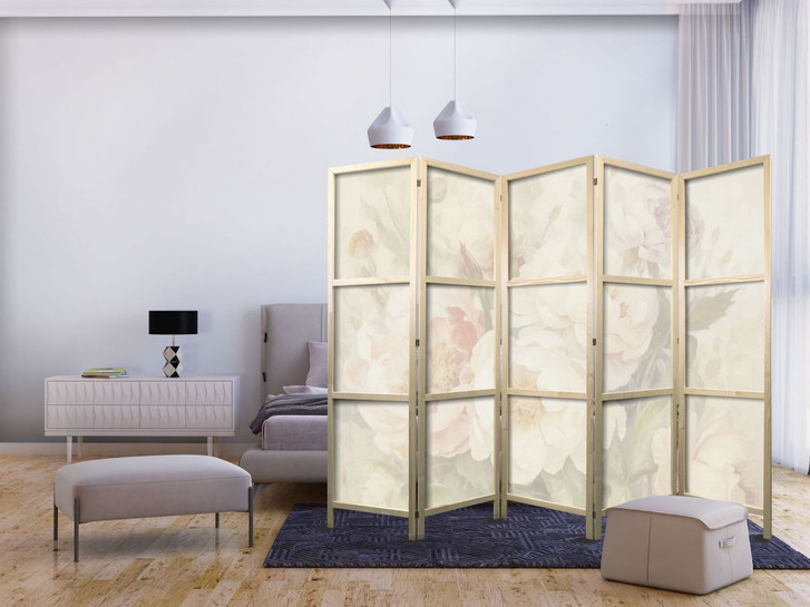 Japanischer Paravent, Raumteiler freistehend, Trennwand - Blooming Peonies Enveloped in White Mist