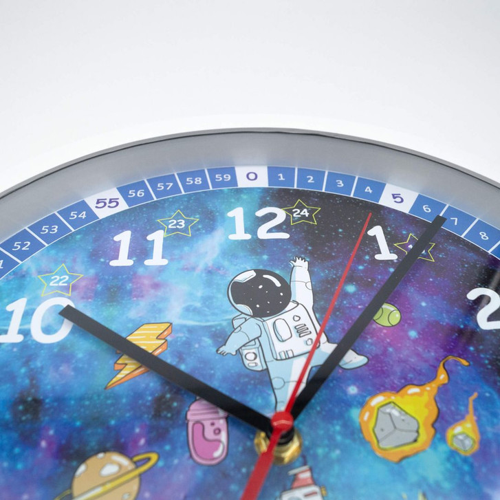 Mit dieser farbenfrohen Kinder-Wanduhr können Ihre Kleinen in die faszinierende Welt des Weltalls eintauchen! Die liebevoll gestalteten Astronauten und Planeten machen das Erlernen der Uhrzeit zu einem spannenden Abenteuer. Grosse, klare Ziffern und farblich abgesetzte Zeiger erleichtern es Ihrem Kind, Stunden und Minuten zu unterscheiden. Die gute Lesbarkeit und das kindgerechte Design machen das Lernen zum Vergnügen und helfen deinem Kind, die Uhrzeit im Handumdrehen zu verstehen. Ideal, um das Zeitgefühl deiner Kinder spielerisch zu entwickeln. Die Lernuhr ist ein tolles Highlight für jedes Kinderzimmer, das Freude und Wissen vermittelt!