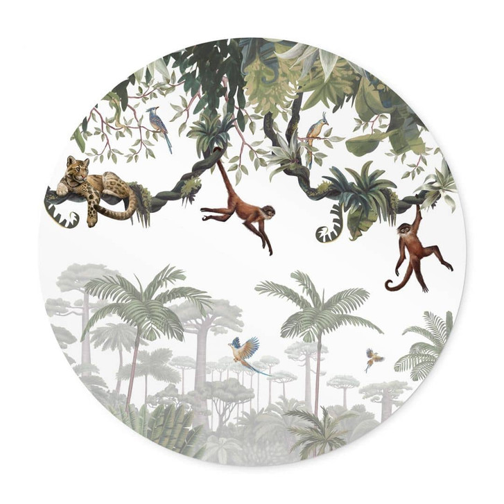 Tauche mit diesem runden Poster in die grüne Naturlandschaft ein und schaffe eine Umgebung zum Wohlfühlen. Das Dschungelbild mit den drei Affen sorgt für die richtige Stimmung zum Spielen und Entdecken. Die detailreiche Darstellung des Regenwaldes bringt frisches Dschungelflair. Verpasse deinen Wänden mit den tropischen Bäumen aus dem Dschungel einen aufregenden Look!