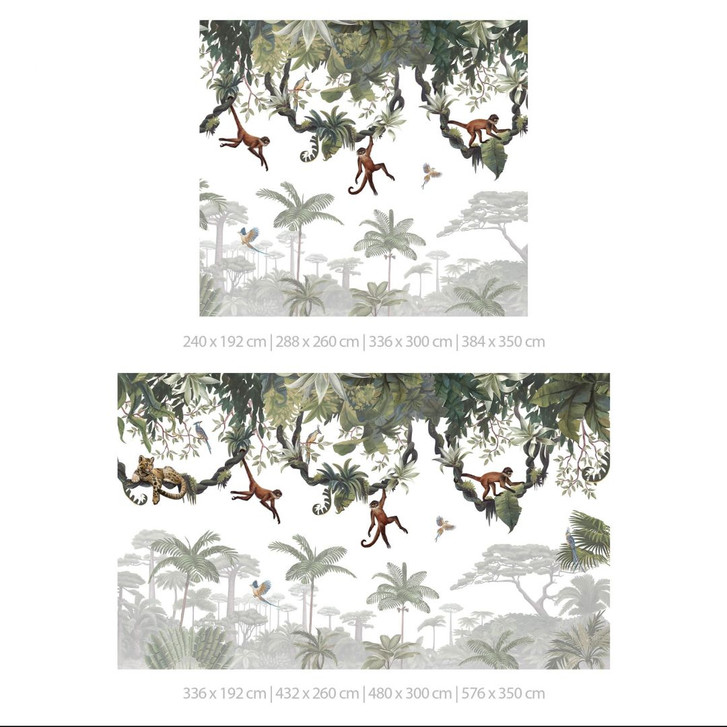 Kein anderer Ort ist so artenreich wie der tropische Wald, in dem man exotische Bäume und Pflanzen bewundern kann. Es ist auch ein aufregender Ort für Tiere. Wenn die drei Affen klettern, springen und sich von den Bäumen hängen lassen, macht es besonders viel Spass, zu spielen und herumzutollen. Das fröhliche Wandmotiv ist ein absoluter Hingucker im Baby- und Kinderzimmer.