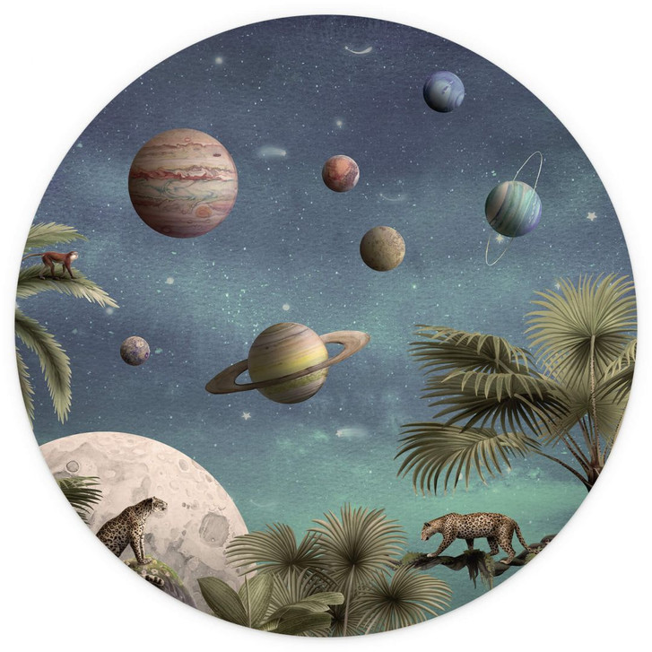 Kinderzimmer Fototapete Kikki Belle - Tropische Fantasiewelt mit Planeten und Palmen - Rund - Selbstklebend/Vlies