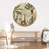 Das Wohl der Kinder ist für Eltern das Wichtigste. Deshalb möchten sie, dass ihre Kinder mit einem Gefühl von Geborgenheit und Wärme aufwachsen. Mit dem runden Wandbild mit der liebevollen Illustration von Oliver Robins verwandeln Sie das Kinderzimmer in eine farbenfrohe Dschungelwelt. Auf dem Boden tummeln sich Zebra, Giraffe, Elefant und Löwe. Ein Affe schwingt sich von Baum zu Baum und ein Tukan sitzt auf einem Palmenblatt.