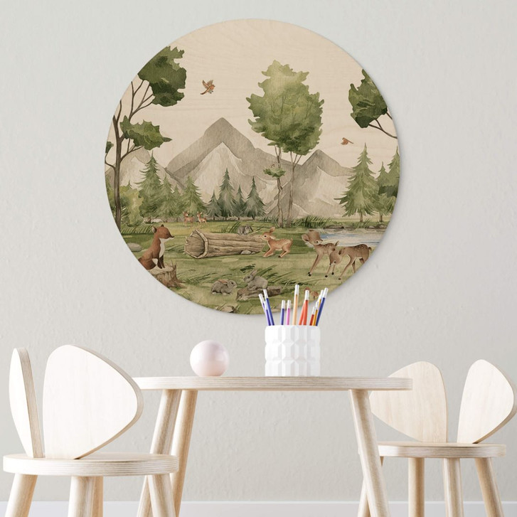 Kinderzimmer Holzbild Oliver Robins - Niedliche Tiere im Wald - Rund