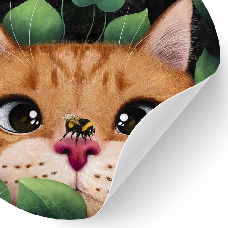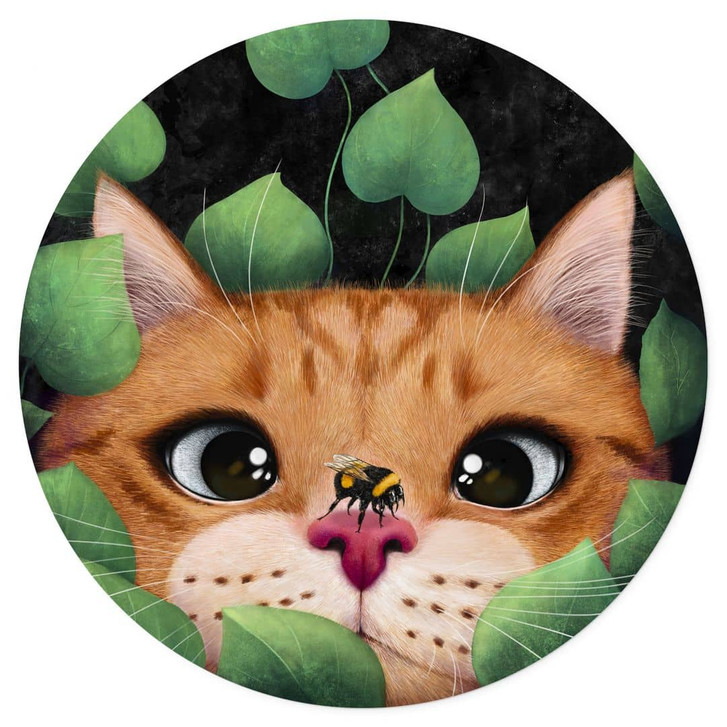 Dieses entzückende Werk von Valeriya Korenkova fängt die unschuldige Neugier einer Katze ein, die durch ein Dickicht üppiger, grüner Blätter späht. Der künstlerische Fokus auf die leuchtenden Augen der Katze und die zarte Hummel auf deiner Nase verleiht dem Bild eine lebendige Verspieltheit.