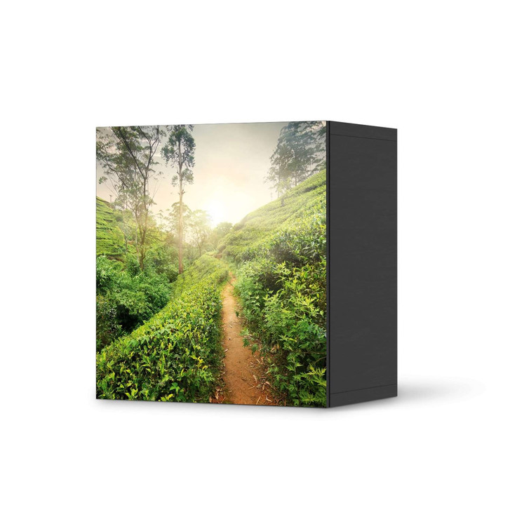 Unsere Klebefolie Green Tea Fields für das Besta Regal 1 Türe ist der Blickfang in jedem Wohnzimmer. Die Dekofolien sind hochwertige, selbsthaftende Vinylfolien (seidenmatt) und können dank Bubble-free Technologie kinderleicht verklebt werden.