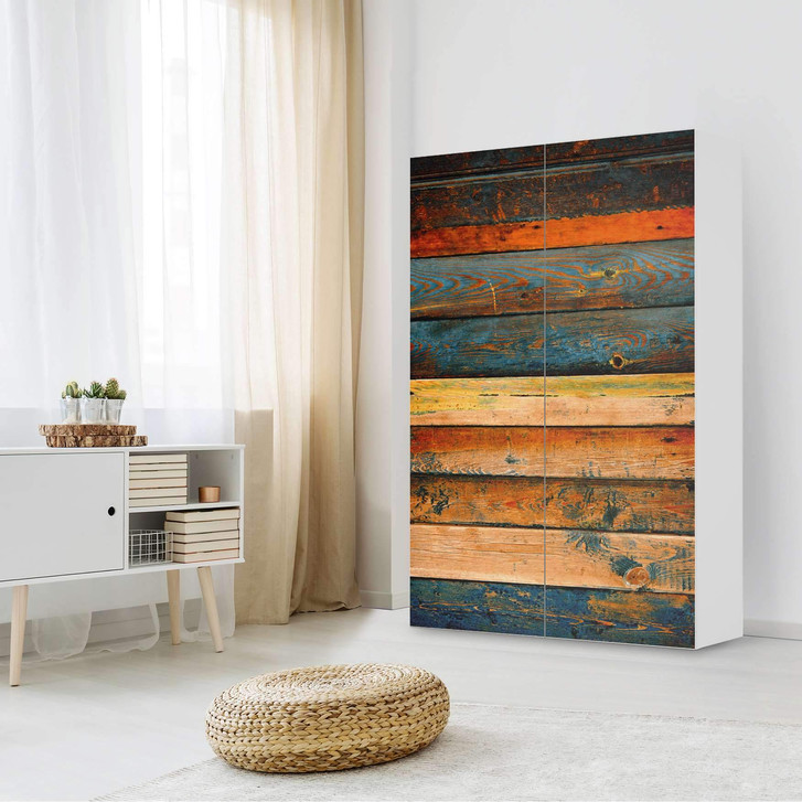 Unsere Klebefolie Wooden für den Besta Schrank 2 Türen (hoch) ist der Blickfang in jedem Wohnzimmer. Die Dekofolien sind hochwertige, selbsthaftende Vinylfolien (seidenmatt) und können dank Bubble-free Technologie kinderleicht verklebt werden.