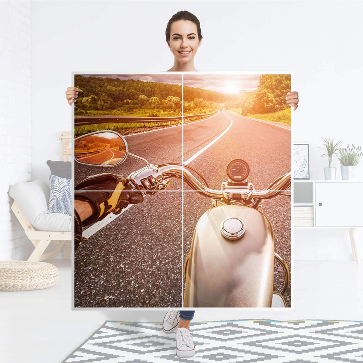 Unsere Klebefolie Easy Rider für den Besta Schrank 4 Türen ist der Blickfang in jedem Wohnzimmer. Die Dekofolien sind hochwertige, selbsthaftende Vinylfolien (seidenmatt) und können dank Bubble-free Technologie kinderleicht verklebt werden.