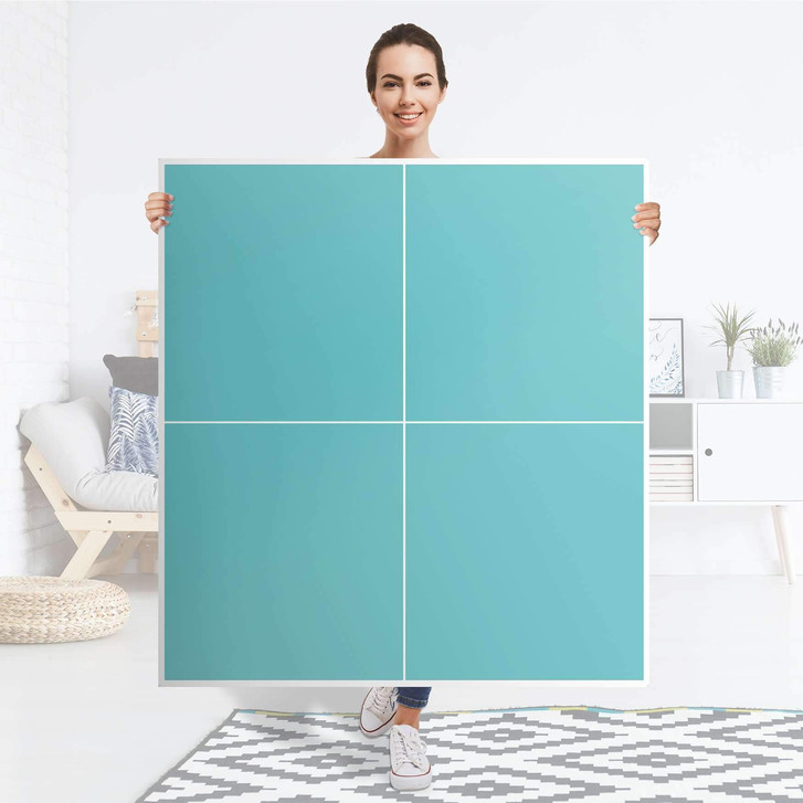 Unsere Klebefolie Türkisgrün Light für den Besta Schrank 4 Türen ist der Blickfang in jedem Wohnzimmer. Die Dekofolien sind hochwertige, selbsthaftende Vinylfolien (seidenmatt) und können dank Bubble-free Technologie kinderleicht verklebt werden.