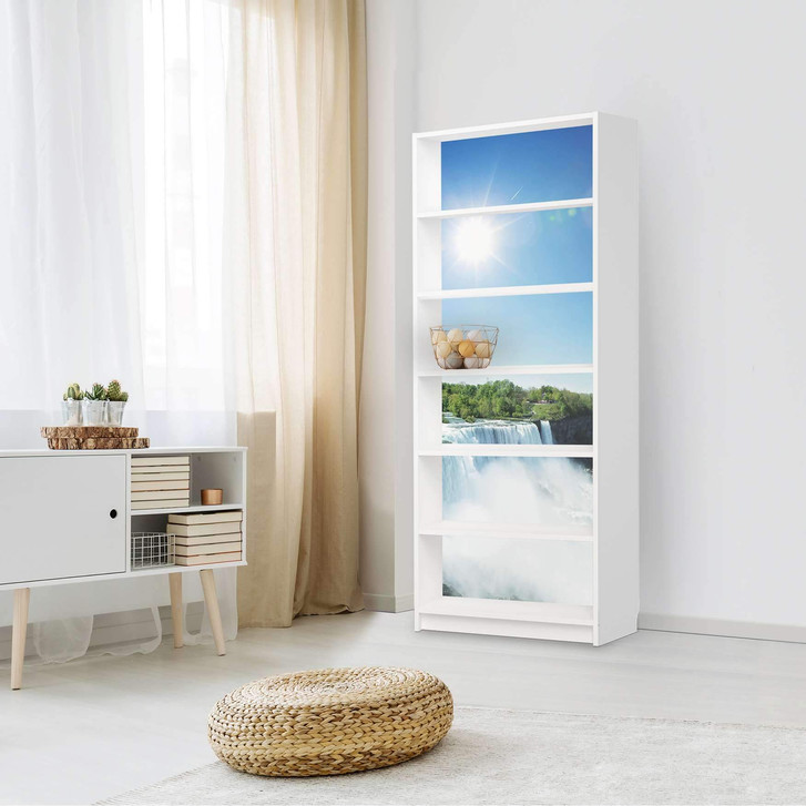 Unsere Klebefolie Niagara Falls für das Billy Regal 6 Fächer ist der Blickfang in jedem Wohnzimmer. Die Dekofolien sind hochwertige, selbsthaftende Vinylfolien (seidenmatt) und können dank Bubble-free Technologie kinderleicht verklebt werden.