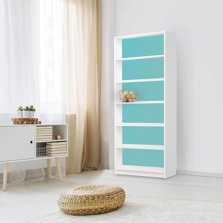Unsere Klebefolie Türkisgrün Light für das Billy Regal 6 Fächer ist der Blickfang in jedem Wohnzimmer. Die Dekofolien sind hochwertige, selbsthaftende Vinylfolien (seidenmatt) und können dank Bubble-free Technologie kinderleicht verklebt werden.
