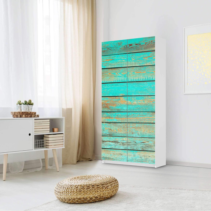 Unsere Klebefolie Wooden Aqua ist passend zugeschnitten für den Pax Schrank 201cm Höhe - 2 Türen und ist der Blickfang in jedem Schlafzimmer. Die Dekofolien sind hochwertige, selbsthaftende Vinylfolien (seidenmatt) und können dank Bubble-free Technologie kinderleicht verklebt werden.