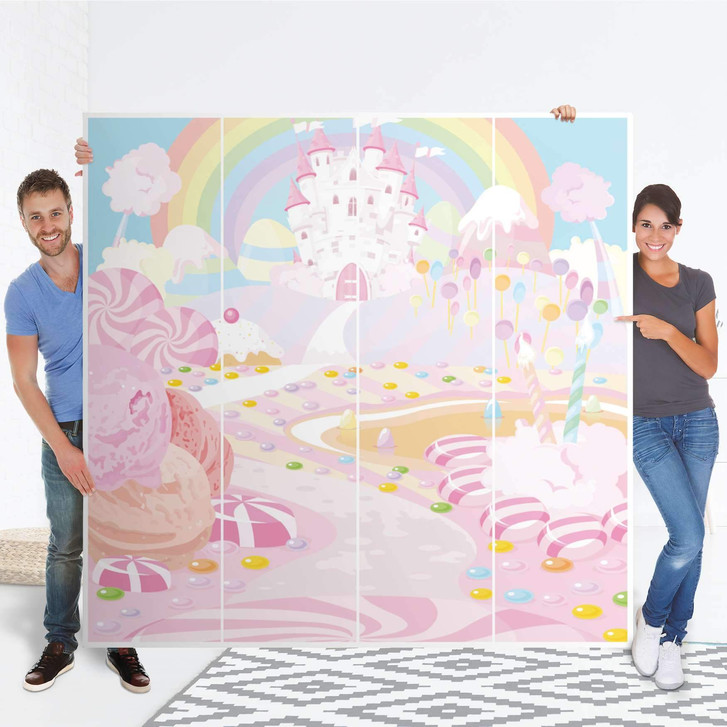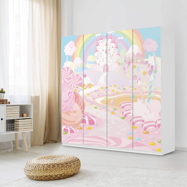 Unsere Klebefolie Candyland ist passend zugeschnitten für den Pax Schrank 201cm Höhe - 4 Türen und ist der Blickfang in jedem Kinderzimmer. Die Dekofolien sind hochwertige, selbsthaftende Vinylfolien (seidenmatt) und können dank Bubble-free Technologie kinderleicht verklebt werden.