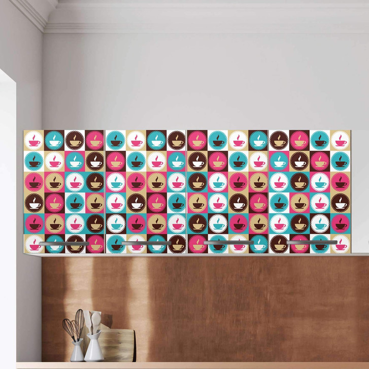 Unsere Klebefolie Coffee Cups (160cm Breite - entspricht der Breite von 4 Türen) für den Wandschrank ist der Blickfang in jeder Küche. Die Küchenfolien sind hochwertige, selbsthaftende Vinylfolien (seidenmatt) und können auf das gewünschte Mass zugeschnitten werden - je nachdem ob die Türkante umklebt werden soll oder nicht.