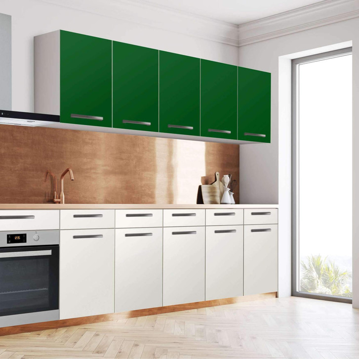 Unsere Klebefolie Grün Dark (200cm Breite - entspricht der Breite von 5 Türen) für den Wandschrank ist der Blickfang in jeder Küche. Die Küchenfolien sind hochwertige, selbsthaftende Vinylfolien (seidenmatt) und können auf das gewünschte Mass zugeschnitten werden - je nachdem ob die Türkante umklebt werden soll oder nicht.