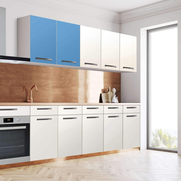 Unsere Klebefolie Blau Light (80cm Breite - entspricht der Breite von 2 Türen) für den Wandschrank ist der Blickfang in jeder Küche. Die Küchenfolien sind hochwertige, selbsthaftende Vinylfolien (seidenmatt) und können auf das gewünschte Mass zugeschnitten werden - je nachdem ob die Türkante umklebt werden soll oder nicht.