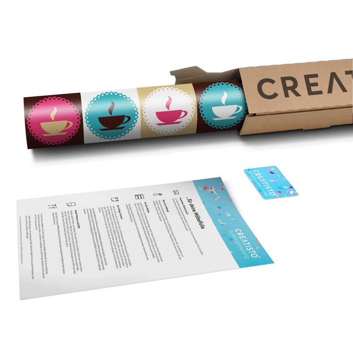 Unsere Klebefolie Coffee Cups (80cm Breite - entspricht der Breite von 2 Türen) für den Wandschrank ist der Blickfang in jeder Küche. Die Küchenfolien sind hochwertige, selbsthaftende Vinylfolien (seidenmatt) und können auf das gewünschte Mass zugeschnitten werden - je nachdem ob die Türkante umklebt werden soll oder nicht.