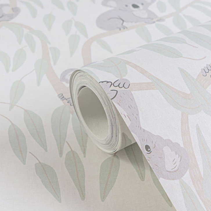 Lilly & Luis - Verspielte Tapete mit niedlichen Koalas auf Ästen in sanften Naturtönen.