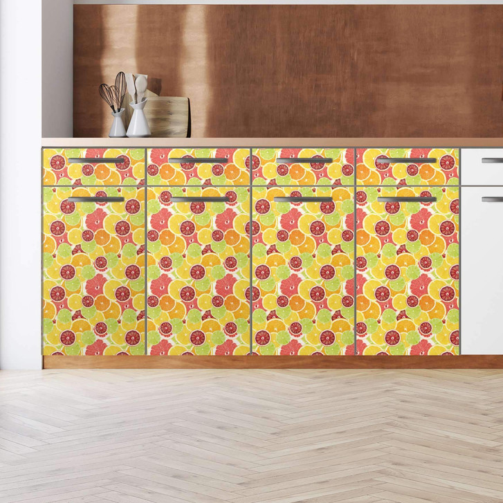 Unsere Küchenfolie Citrus (160cm Breite - entspricht der Breite von 4 Türen) für den Unterschrank ist der Blickfang in jeder Küche. Die Küchenfolien sind hochwertige, selbsthaftende Vinylfolien (seidenmatt) und können auf das gewünschte Mass zugeschnitten werden - je nachdem ob die Türkante umklebt werden soll oder nicht.
