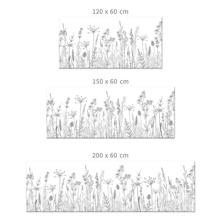 Hier beginnen wir den Tag und lassen den Abend ausklingen: die Küche. Es ist ein Ort, an dem Menschen zusammenkommen, um zu kochen und zu essen. Verpasse ihr einen neuen Look, um sie noch gemütlicher zu machen. Geniesse den Anblick einer schwarz-weissen Wiesenillustration. Die Wildblumen und Wiesenkräuter bringen eine tolle Natürlichkeit in dein Zuhause! Das Motiv ist erweiterbar, d. h. alle Varianten mit gleicher Höhe können nebeneinander positioniert werden, sodass eine noch grössere Blumenwiese entsteht.