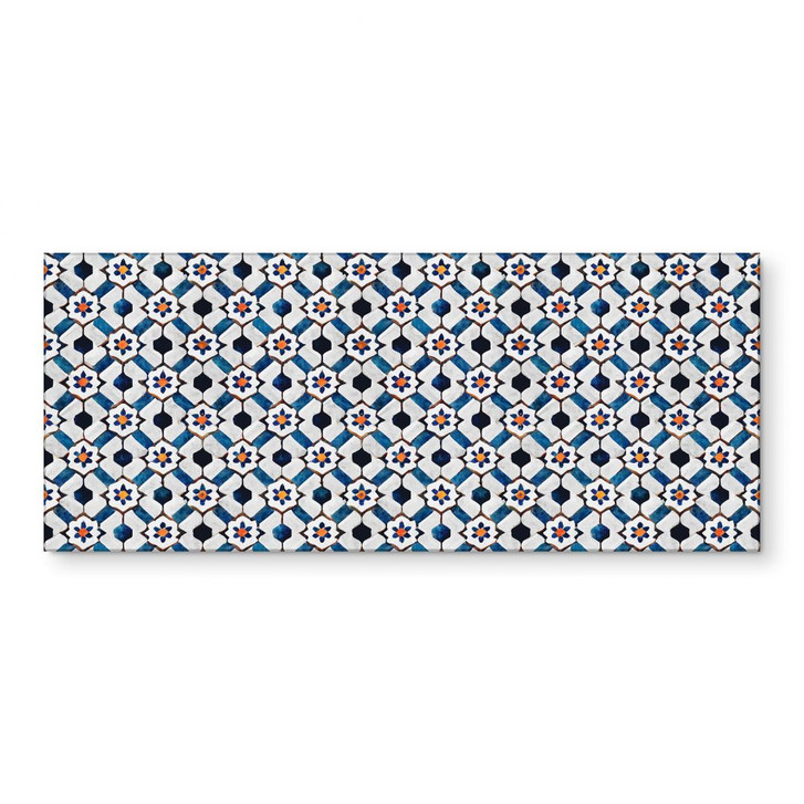Diese moderne Küchenrückwand bietet die perfekte Kombination aus Funktionalität und Ästhetik. Das ansprechende geometrische Muster, verziert mit stilisierten Blumen in leuchtenden Blau-, Weiss- und Orangetönen, setzt einen frischen und lebendigen Akzent in Ihrer Küche. Das detailreiche Design verleiht dem Raum eine harmonische Atmosphäre und lässt sich mit einer Vielzahl von Einrichtungsstilen kombinieren.