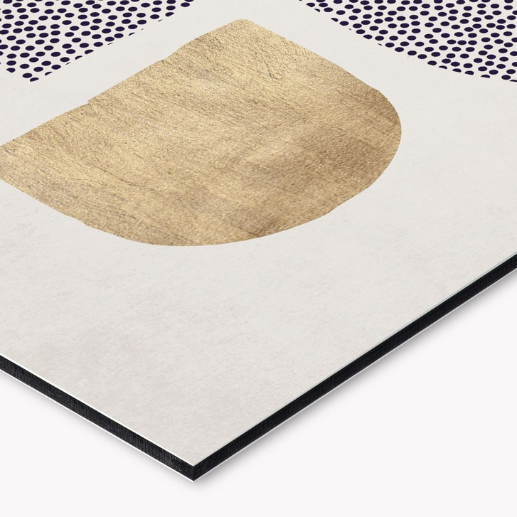 Der abstrakte Kunstdruck mit goldenen, geometrischen Formen schmückt jedes Zuhause auf moderne und stilvolle Weise. Die Küchenrückwand mit dem künstlerischen Design dient als Schutz vor Schmutz und Spritzern beim Kochen und sieht dabei elegant aus.