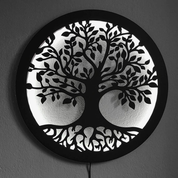 Der Lebensbaum, auch Weltenbaum genannt, steht für die ganzheitliche Verbindung zwischen Himmel und Erde. Der Baum ist die Achse der Welt. Seine tiefen und starken Wurzeln reichen bis in die Erde und der Himmel ruht auf seinen Baumkronen. Im Buddhismus ist der Lebensbaum ein Feigenbaum und wird als Bodhi-Baum oder Buddha-Baum bezeichnet. Der Überlieferung nach erlangte Siddhartha Gautama unter einem Feigenbaum die Erleuchtung. Wenn es im Raum dunkel ist, kannst du den Lebensbaum indirekt mit dem LED-Ring in 7 verschiedenen Farben beleuchten.