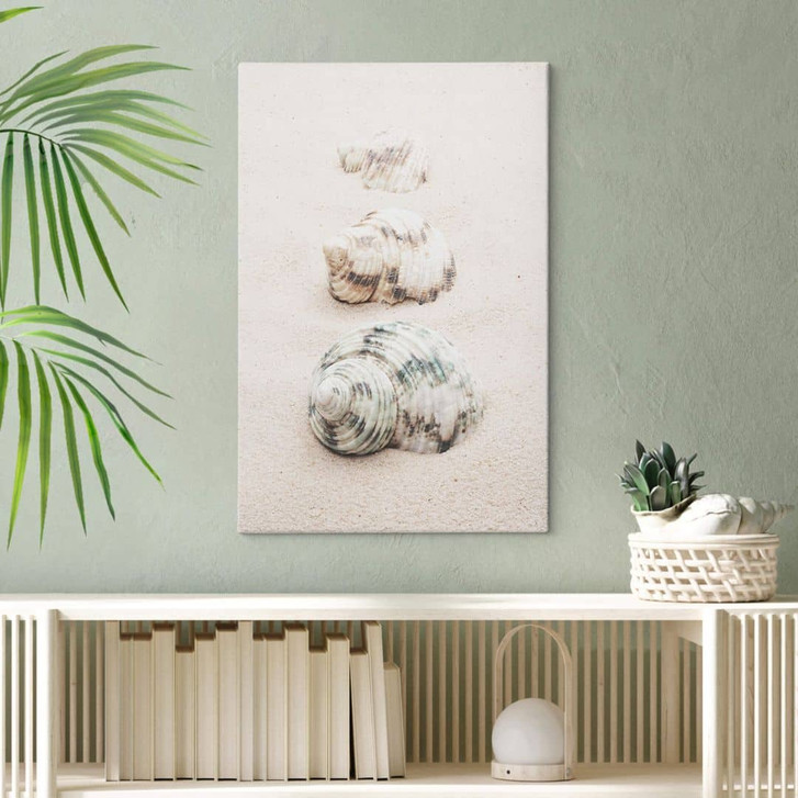 Bereichere dein eigenes Zuhause mit Originalbildern und schaffe eine gemütliche Atmosphäre! Am Meer fühlst du dich wohl. Auf dem sandigen Boden kannst du dich von schönen Dingen überraschen lassen. Das Leinwandbild mit den drei Meeresschnecken sorgt für maritimes Flair.