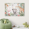 Dieses beeindruckende Leinwandbild fängt die farbenfrohe und lebendige Welt des afrikanischen Dschungels ein und bringt sie direkt in dein Zuhause. Das Motiv zeigt eine fröhliche Szene, in der Elefanten, Giraffen, Flamingos, Affen und exotische Vögel inmitten üppiger Pflanzen in Harmonie zusammenleben. Die liebevoll gestalteten Details und die sanften Aquarellfarben verleihen dem Bild eine warme und einladende Ausstrahlung, die sowohl Kinder als auch Erwachsene anspricht.