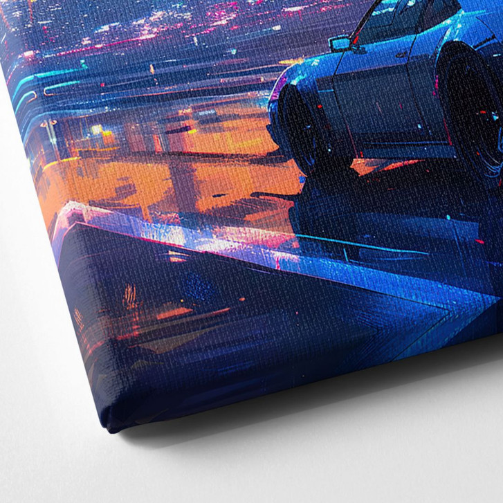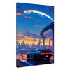 Dieses Leinwandbild fängt die Essenz einer futuristischen Metropole ein und kombiniert Technologie, Geschwindigkeit und atemberaubende Farben. Die dynamische Szene zeigt einen Sportwagen, der auf einer regennassen Strasse durch eine glitzernde Skyline fährt, während sich die Lichter der Stadt im Wasser spiegeln. Der strahlende Sonnenuntergang am Horizont, kombiniert mit der futuristischen Architektur und den leuchtenden Neonlichtern, schafft ein unvergessliches visuelles Erlebnis.