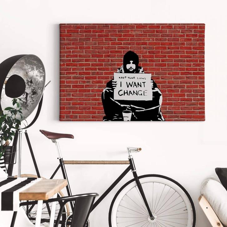 Starke Kunst mit tiefgründiger Bedeutung. Das Kunstwerk des legendären Streetart-Künstlers Banksy zeigt einen Obdachlosen, der vor einer Backsteinmauer sitzt. Auf den ersten Blick scheint er um Kleingeld zu bitten. Auf seinem Schild steht jedoch: Behalte deine Münzen, ich will Kleingeld. Damit drückt er aus, dass er sich statt Münzen einen gesellschaftlichen Wandel wünscht. Dieses Motiv tauchte erstmals in Melbourne, Australien, auf.