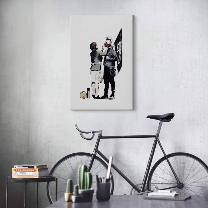 Ein Bild, das mehr sagt als tausend Worte. Dieses Kunstwerk von Banksy drückt ein soziales Ideal aus: eine Mutter, die sich um ihr erwachsenes Kind kümmert. Sie liebt und akzeptiert ihren Sohn so wie er ist, auch wenn er nicht dem heutigen „Mainstream“ entspricht. Dieses Graffiti-Motiv wurde erstmals auf einer Kunstausstellung in Bristol mit dem Titel „Banksy Versus Bristol Museum“ ausgestellt.