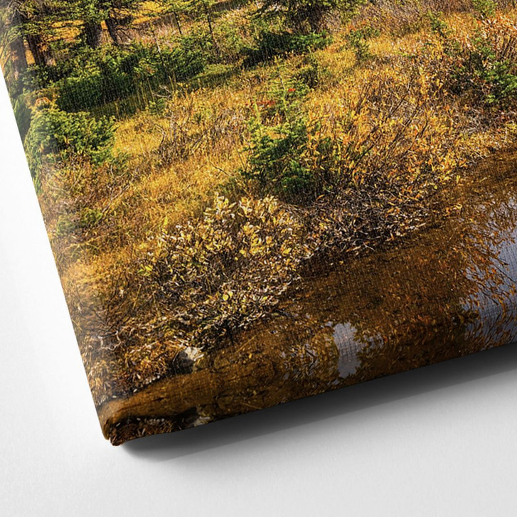 Die leuchtenden Farben der Herbstvegetation harmonieren perfekt mit den satten Grüntönen der Kiefern und den kühlen Tönen der Berge. Die Leinwand schafft eine warme, beruhigende Atmosphäre, die zum Verweilen einlädt. Das Bild strahlt Ruhe und Gelassenheit aus und zelebriert gleichzeitig die Schönheit der Natur.
