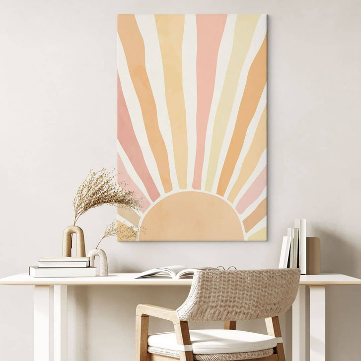 Schaffe mit diesem Wandbild ein angenehmes Raumgefühl! Es ist die ideale Kombination aus Ästhetik und Harmonie, die zum Entspannen und Geniessen einlädt. Die Illustration von Manovski zeigt eine Sonne im Boho-Stil. Die Sonnenstrahlen sind in verschiedenen Rosa- und Orangetönen gestaltet.