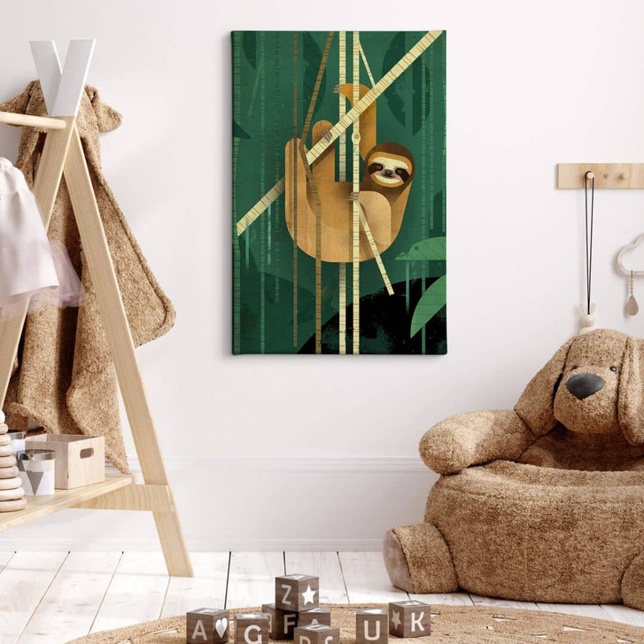 Wenn wir den Namen Faultier hören, denken die meisten von uns, dass das Tier faul ist. Tatsächlich ist es aber nur sehr langsam und bewegt sich in Zeitlupe. Das ist nicht so schlimm, denn so kann es im tropischen Regenwald viel Energie und Kraft sparen. Man erkennt das Faultier an seinen langen Krallen, aber vor allem daran, dass es sich den ganzen Tag über durch Bäume bewegt. Am liebsten bewegt es sich gar nicht und schläft viel. Das Faultier als Wandbild – ein perfektes Motiv zum Entspannen und um einen Ort der Ruhe zu schaffen.