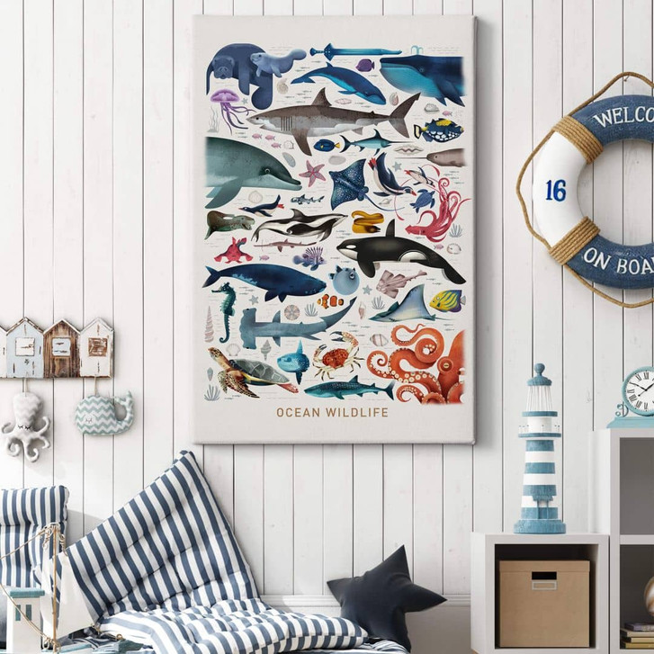 Toben, lernen, wachsen – ein Kinderzimmer muss viel aushalten und mit dieser Dekoration kannst du helfen, es noch besser zu machen. Mit dem Leinwandbild des Illustrators Dieter Braun holst du dir eine spannende Tierwelt ins Kinderzimmer. Es zeigt verschiedene Bewohner der Ozeane – von Walen, Haien und Delfinen über Schildkröten und Pinguine bis hin zu Fischen, Seepferdchen und Muscheln. Die Tiere sind mit ihren englischen Namen beschriftet.