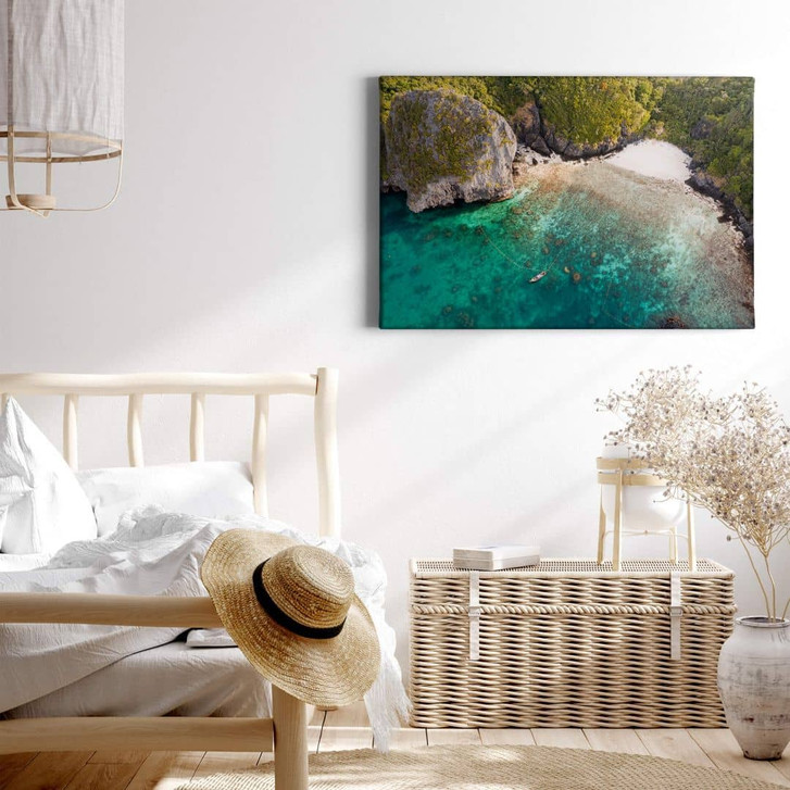 Nächster Halt: die geheimnisvolle Bucht einer paradiesischen Insel. Kristallklares Wasser, weisse Sandstrände, umgeben von einer grünen Oase. Dieses Fotomotiv entführt an einen traumhaften Ort, an dem Stress und Hektik keinen Platz haben. Entspannen und geniessen lautet die Devise. Als dekoratives Bild schafft es eine entspannte Atmosphäre wie in der Südsee und sorgt das ganze Jahr über für tolle Urlaubsstimmung in den eigenen vier Wänden. Vergessen Sie für einen Moment Ihren vollen Terminkalender und gönnen Sie sich eine Auszeit mit diesem herrlichen Blick auf die traumhafte Insel!