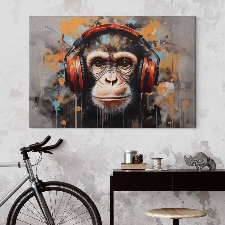 Leinwandbild Pop Art – Affe mit Kopfhörern auf beigem Hintergrund