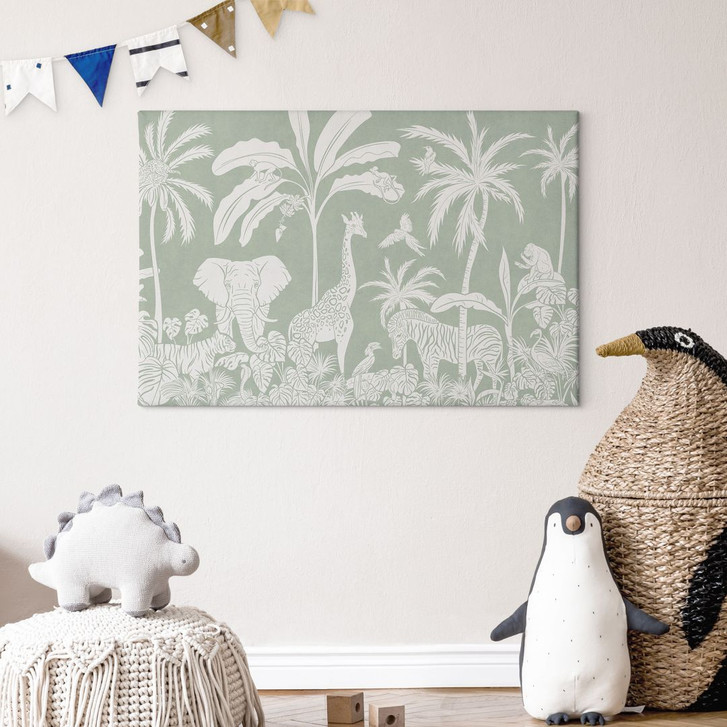 Die beruhigende grüne Farbgebung bringt ein Gefühl von Harmonie und Verbundenheit in deinen Raum. Die stilisierten Blätter, Palmen und exotischen Pflanzen schaffen eine sanfte, ruhige Atmosphäre, während die liebevoll illustrierten Tiere das Motiv zum Leben erwecken.